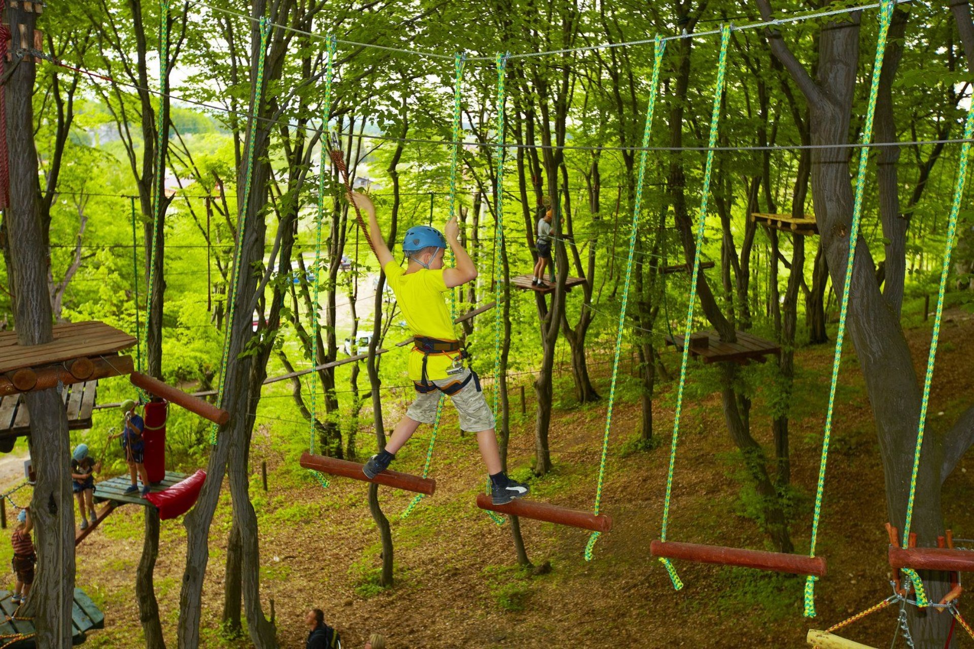 – trasa zielona – dla dzieci od szóstego roku życia, wzrost maksymalny 150 cm (trzeba swobodnie sięgać ręką na wysokość 150 cm). Trasa składa się z 10 przeszkód o łącznej długości 100 metrów. Do pokonania mamy między innymi tyrolki, mosty, siatki, równoważnie oraz pętle.
