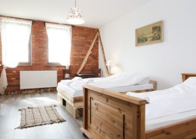 Nowoczesny budynek w stylu kaszubskim oddany do użytku w 2015 roku, położony przy lesie w samym sercu Kaszub. Zakwaterowanie w pokojach 3-, 4- i 5-osobowych z łazienką, TV oraz Wi-Fi. W części pokoi taras z widokiem na zwierzęta, ujeżdżalnię i Jezioro Ostrzyckie. Do dyspozycji Uczestników sala rekreacyjna z bilardem, piłkarzykami i ping-pongiem, plac zabaw, spory teren zielony.